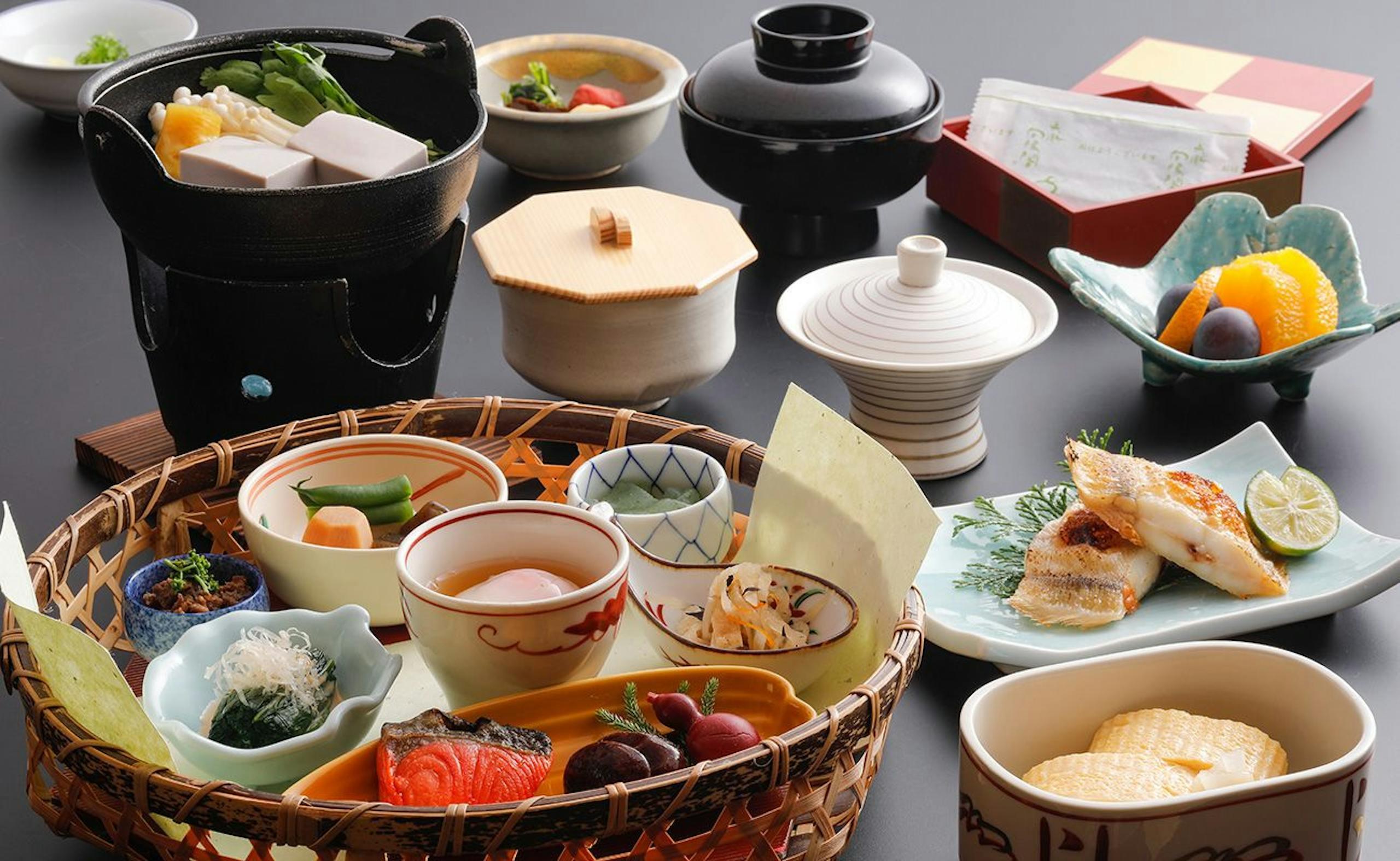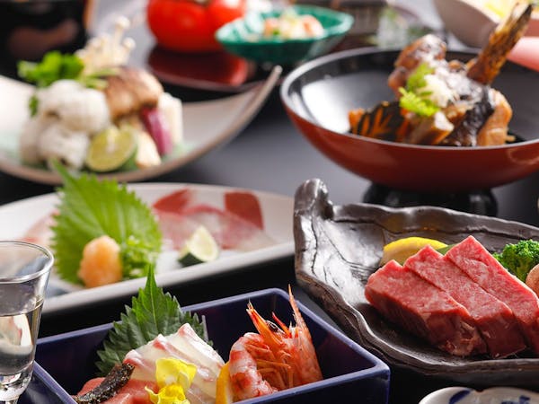 宿泊時の食事は季節の旬会席や炭火焼会席料理、食べ放題のビュッフェ料理を楽しむことができます。