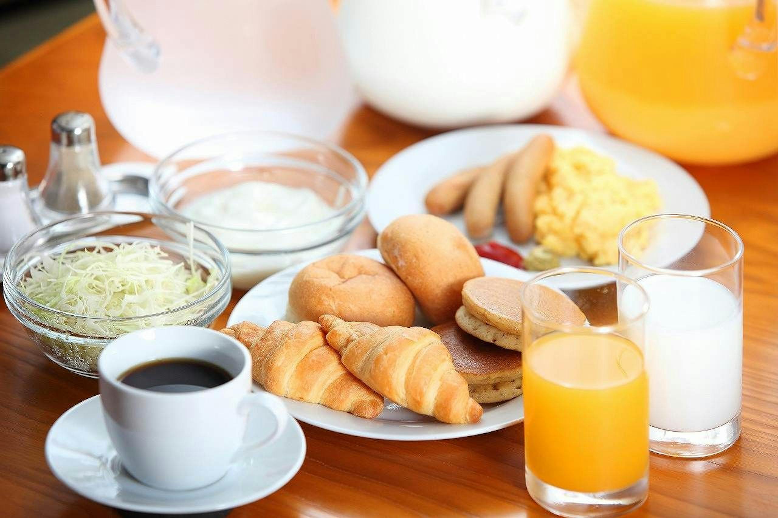 バイキング朝食の内容は各種パン、バターとジャム、ヨーグルト、サラダ、コーヒー、紅茶、ジュース、スープ、ソーセージ又はベーコン、オムレツ、ウインナーソーセージなどとなっています。