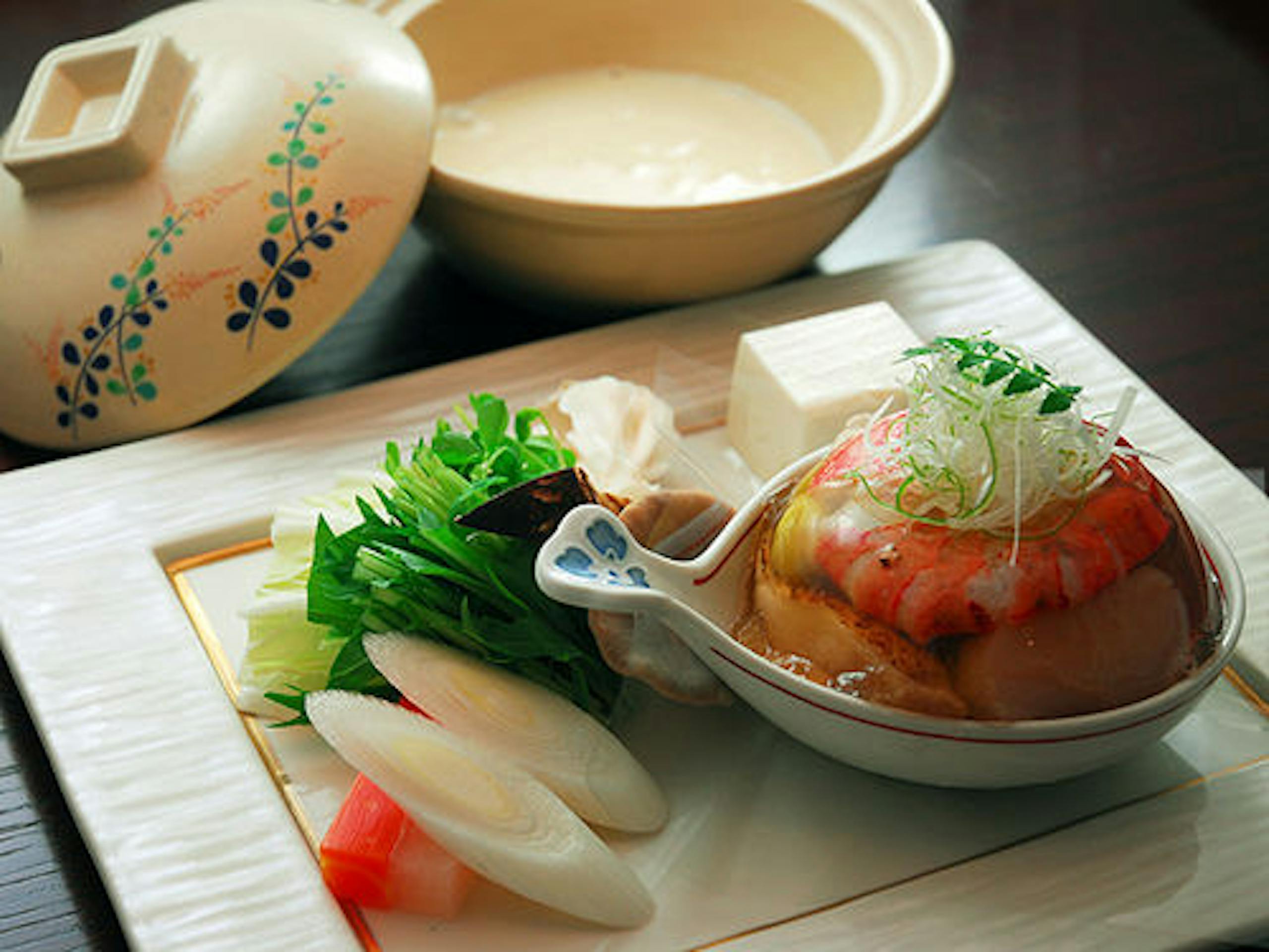 ・夕食内容は食前酒、先付、旬の前菜盛り合わせ、蟹しゃぶや魚介の椀物、名物「雲海鍋」(すき焼き風のメイン鍋)、伊勢海老や旬魚の焼物、蟹雑炊、香の物、デザート