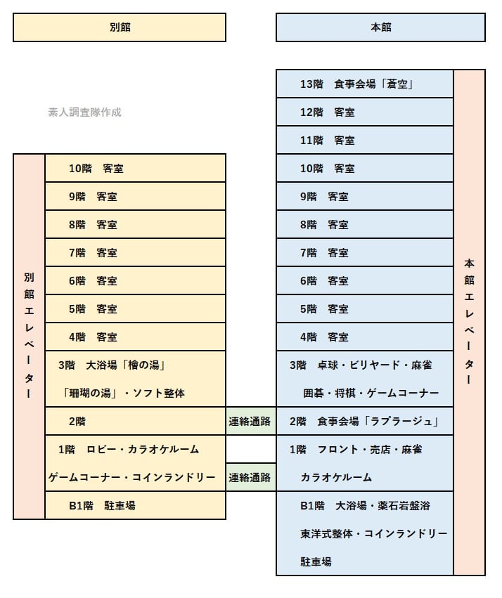 カラオケサロン、大浴場、サウナ、売店、自動販売機、コインランドリー(有料)、ゲームコーナー、麻雀室、卓球、パソコン利用可、マッサージサービス、モーニングコール、宅配便