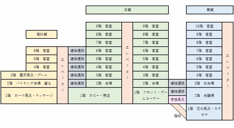 露天風呂は高砂館の3階、バイキングレストランは高砂館の2階、ローマ風呂は高砂館の1階ですから、エレベーターだけで移動できる高砂館の部屋が3館中で一番便利です。