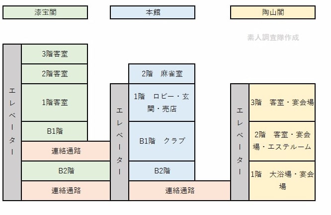 さくらや旅館の建物は地下通路でつながった地下2階・地上3階建ての漆宝閣、地下2階・地上2階建ての本館、地上3階建ての陶山閣という3つの建物があります。