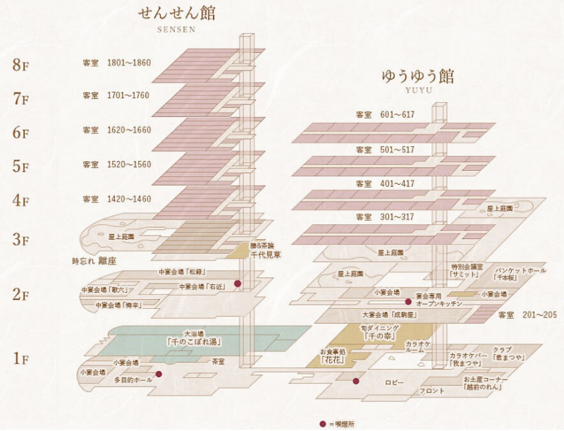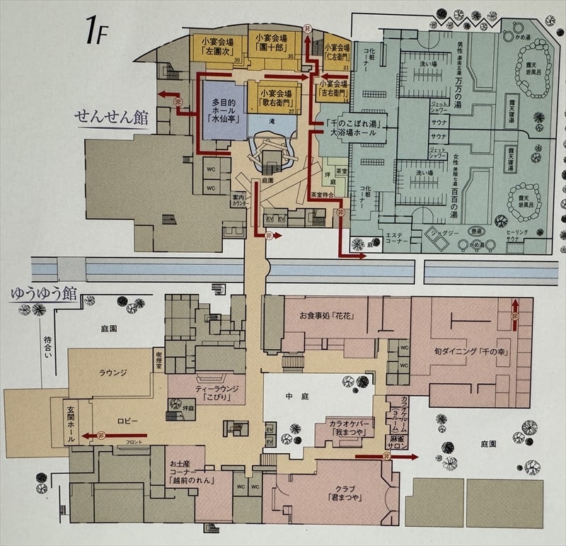 館内図を見てもらうとわかるのですが、せんせん館に宿泊した方が大浴場はエレベーターで1階まで下りてすぐですからとても便利でした。