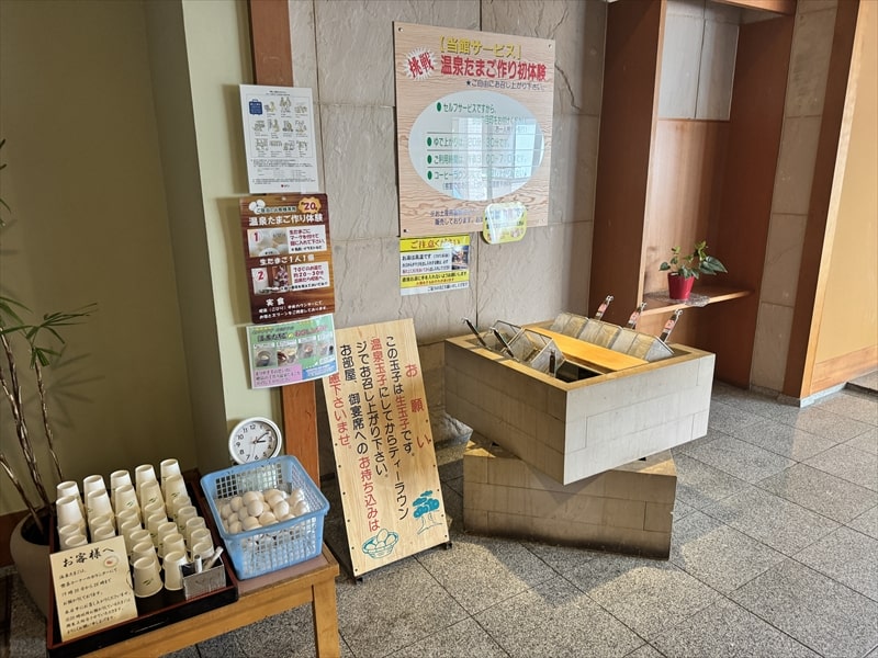フロントロビーのラウンジの横では午後3時から午後7時までセルフで温泉卵造りのサービスが行われています。