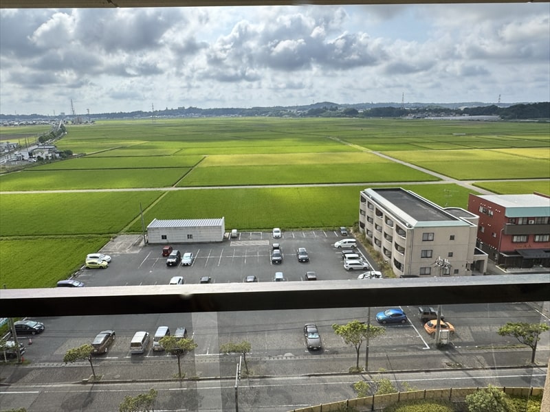 部屋の窓からの景色は第三駐車場の向こうには水田の景色が広がっていました。