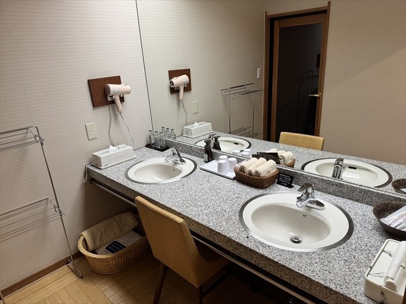 家族で宿泊するのですから和室はゆうゆう館の10畳よりもせんせん館の12.5畳の方が広縁も広いですし、洗面所も2ボウルとなって広いなどゆったりとしていますのでお勧めです。