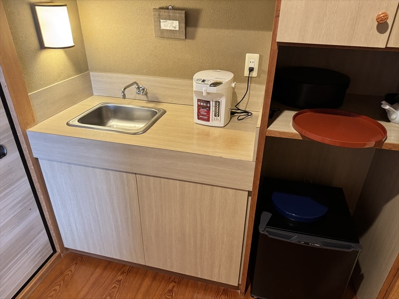 ミネラルウオーターが1本ずつのサービスがありましたし、水屋には電気ポット、冷水が入ったポット、グラス、湯のみが置かれています。