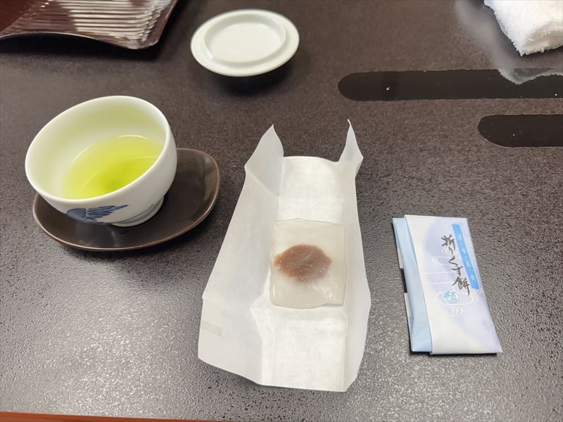部屋まで案内してくれた中居さんがお茶のサービスをしてくれますし、お茶請けは折り葛餅が置かれていました。