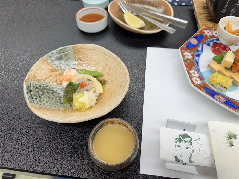 また食事もせんせん館2階の中宴会場の「右近」でしたのでこちらもエレベーターですぐ行けましたのでとても便利でした。