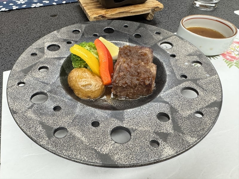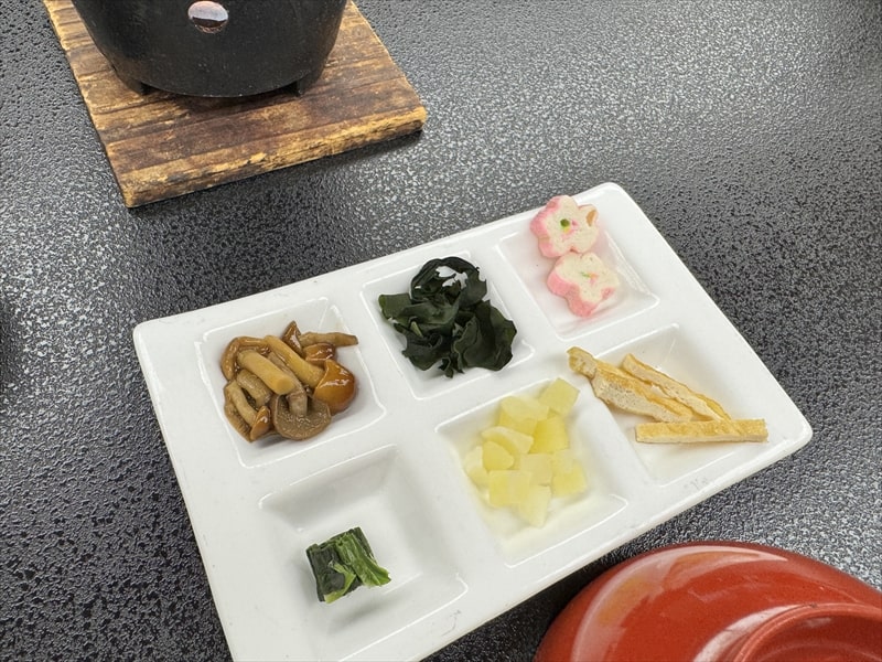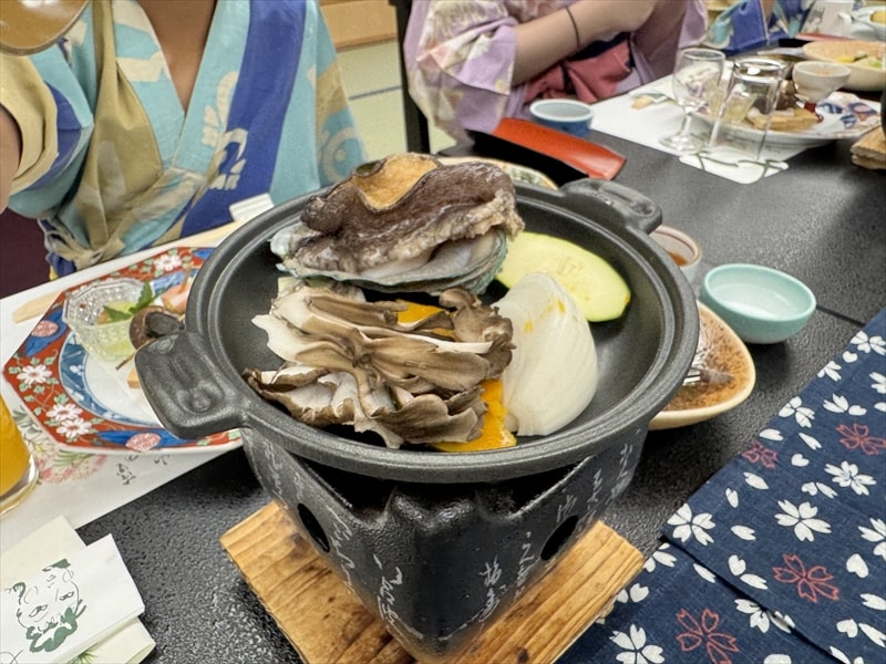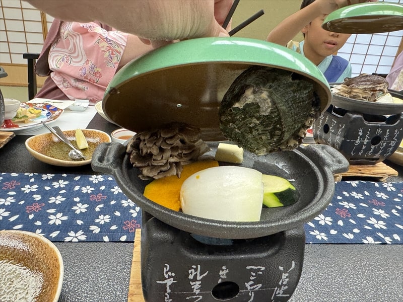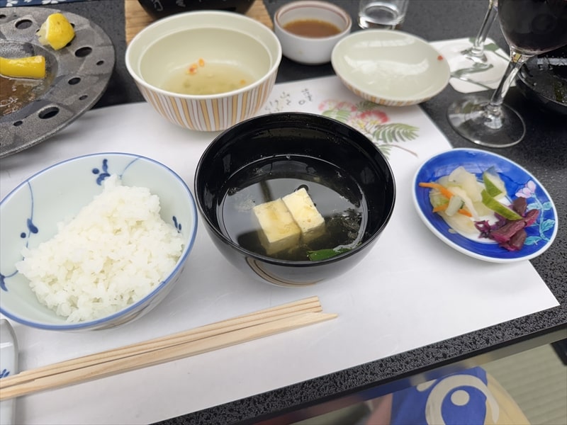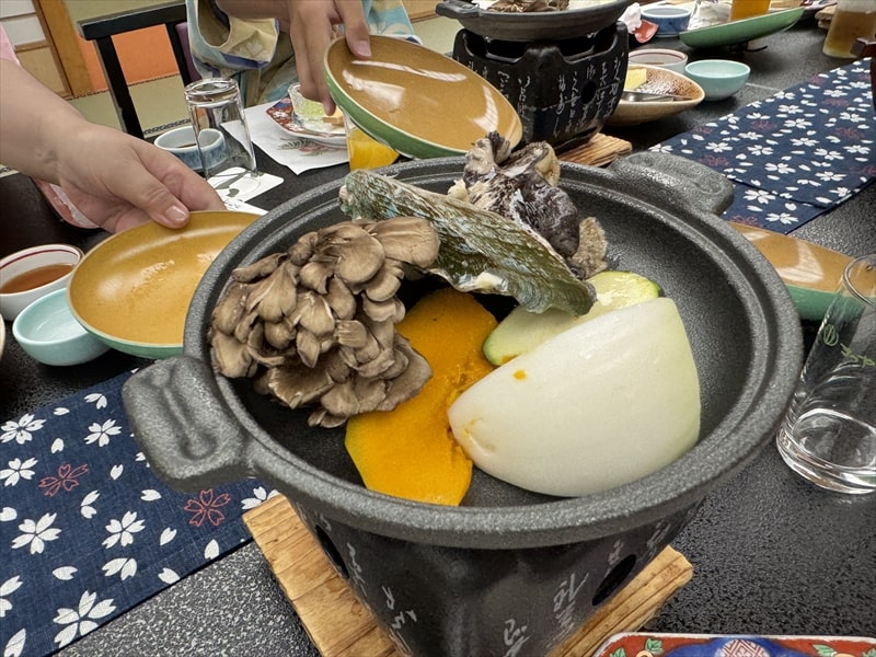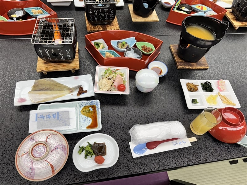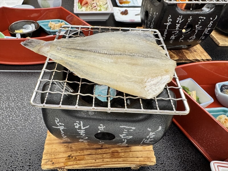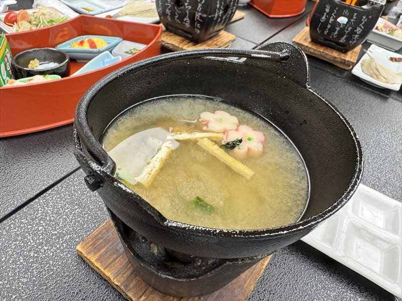 魚は固形燃料で網の上で焼いて頂きますし、味噌汁は自分で具(なめ茸・ワカメ・麩・ほうれん草・ジャガイモ・揚げ)を鉄鍋の味噌汁に入れて固形燃料で温めて頂きます。
