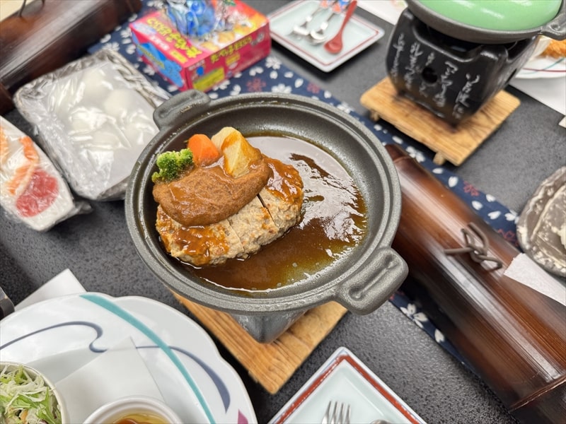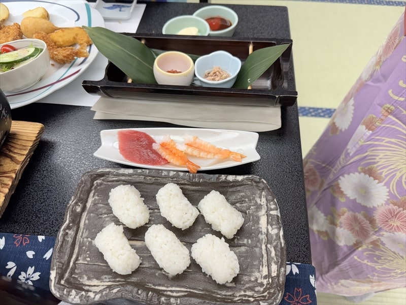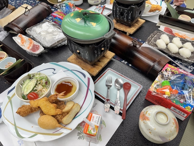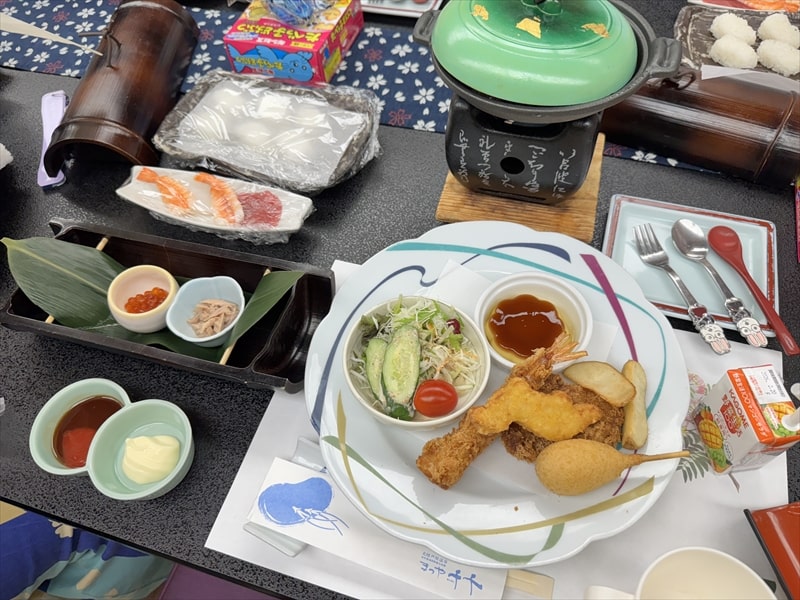 幼児の料理は海老フライ、唐揚げ、フライドポテト、ハッシュドポテト、フランクフルト、サラダ、プリンが載ったプレート、陶板で温めるハンバーグ、親が作るお寿司の軍艦巻き(マグロ・海老・イクラ・シーチキン)、茶碗蒸し、ジュース、お菓子、おもちゃとなっていました。