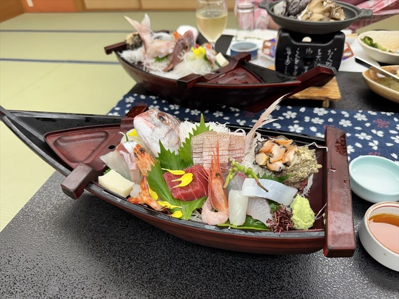 宿泊プランは海の幸を堪能したい方向けのお刺身10種盛「黒船」1人1台付きの季節会席を選びました。