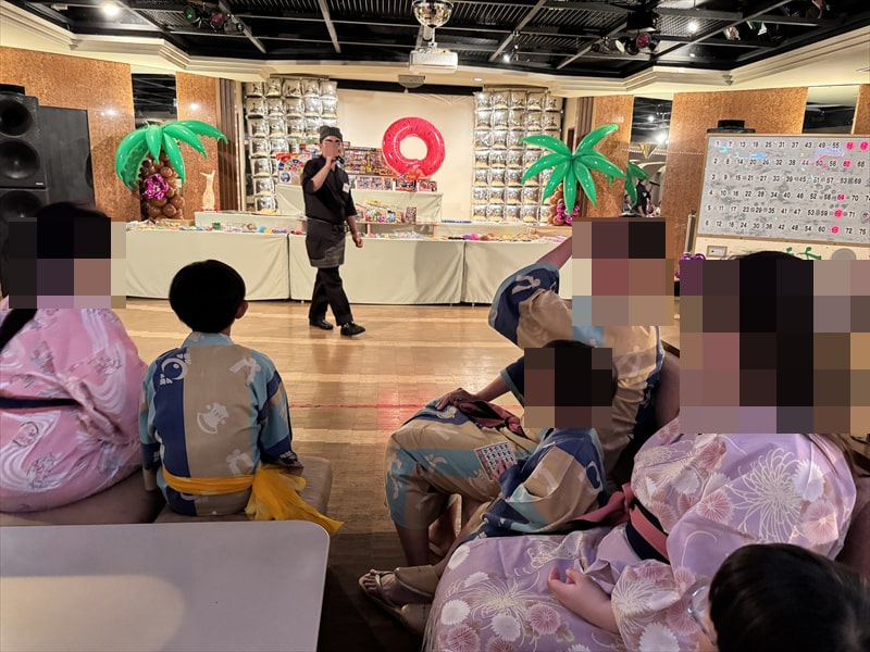 また夕食後には8時30分からビンゴ大会がクラブ「君まつや」の会場で行われていて、ビンゴカードを1枚500円で購入して子供が楽しみました。