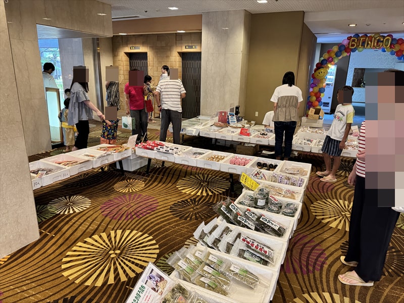 参加者全員がビンゴになるまで行ってくれて、ビンゴになった順番に会場前に並べられた景品をもらうことができます。