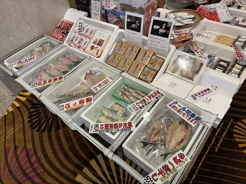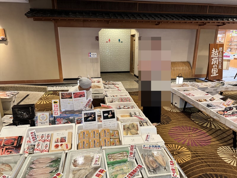 また朝6時30分から売店前では朝一が行われていて、干物やガサ海老、甘えび、鯖寿司、海産物などが販売されていました。