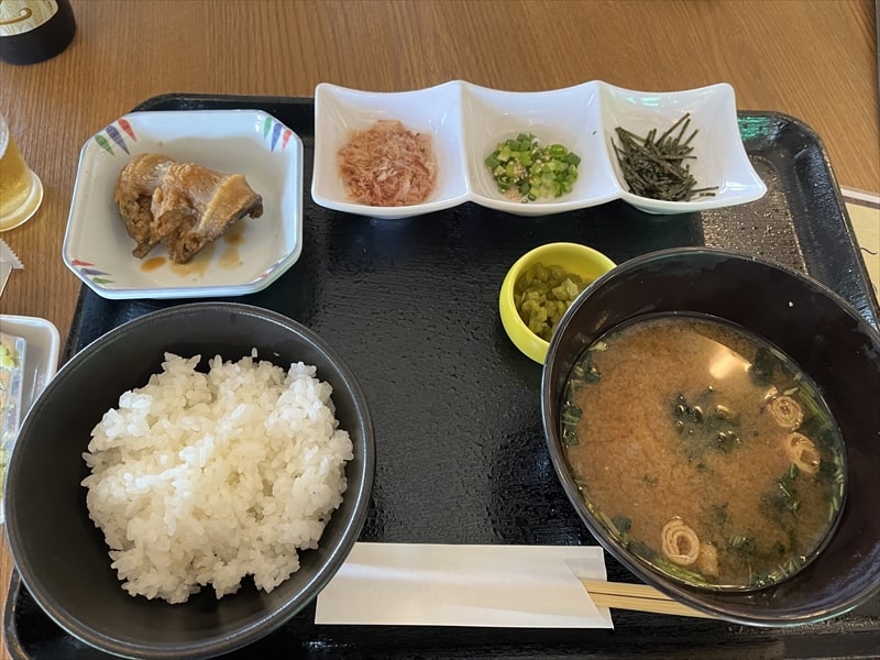 運ばれて来たものはご飯と薬味と味噌汁と安曇野名物の紅鱒のから揚げとなっています。