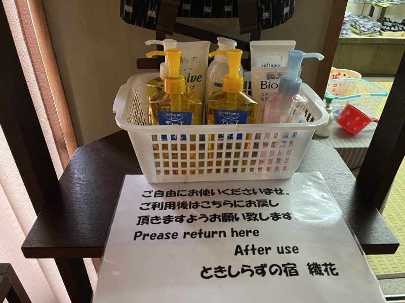 クレンジングなどは浴衣が置かれている所にありますので入浴時に大浴場に持って行きます。