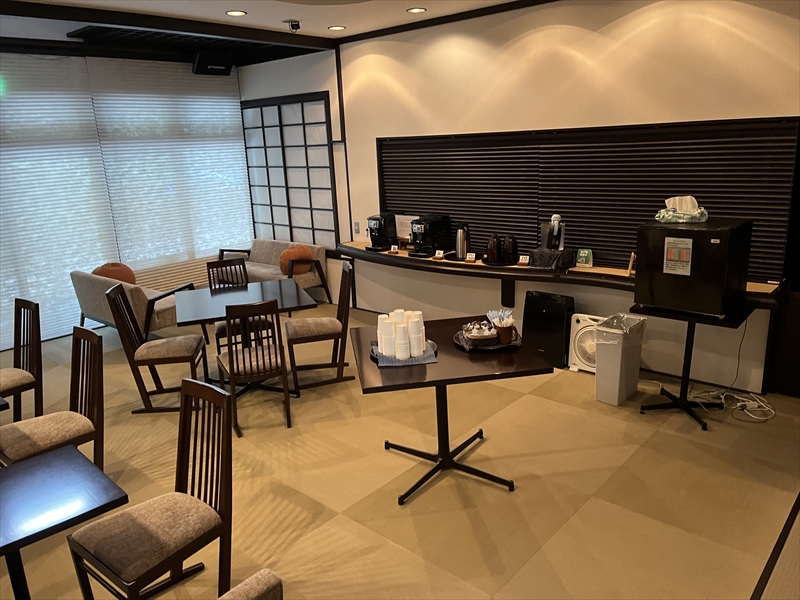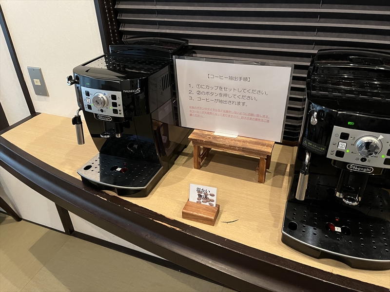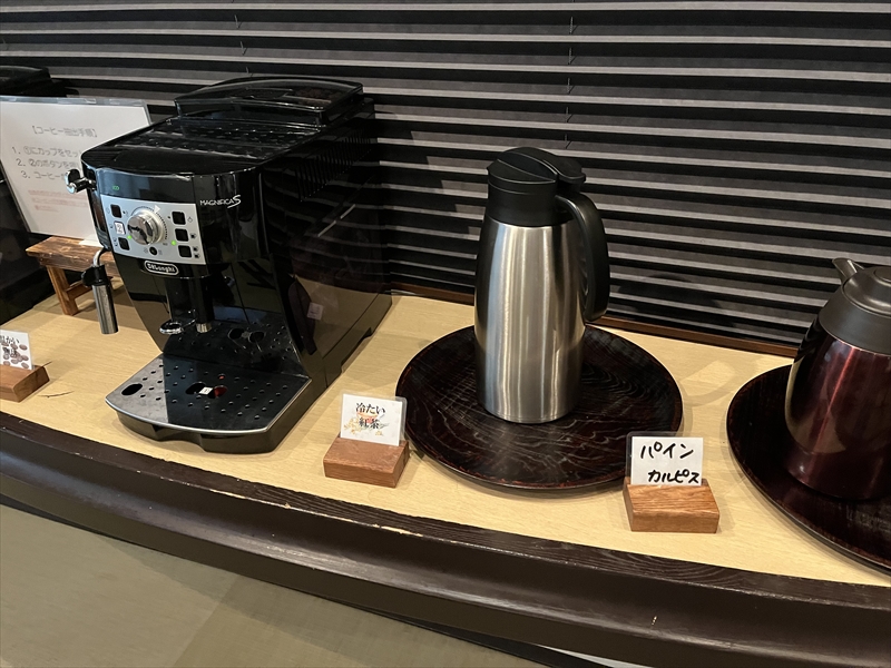 食事後にはドリンクサービスが行われている部屋でデロンギのコーヒーメーカーの美味しい入れたてのコーヒーを飲むことができます。