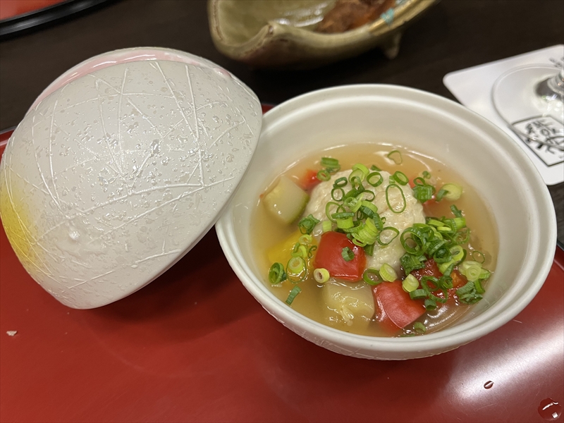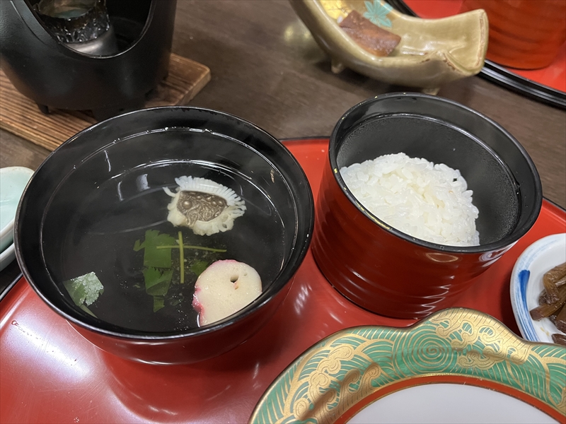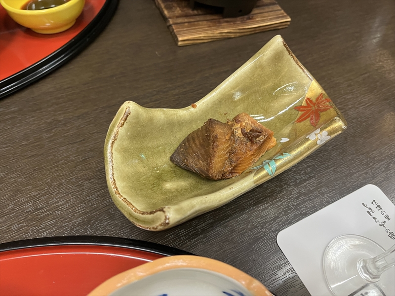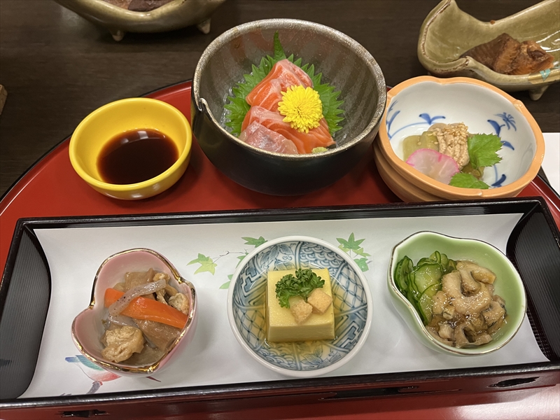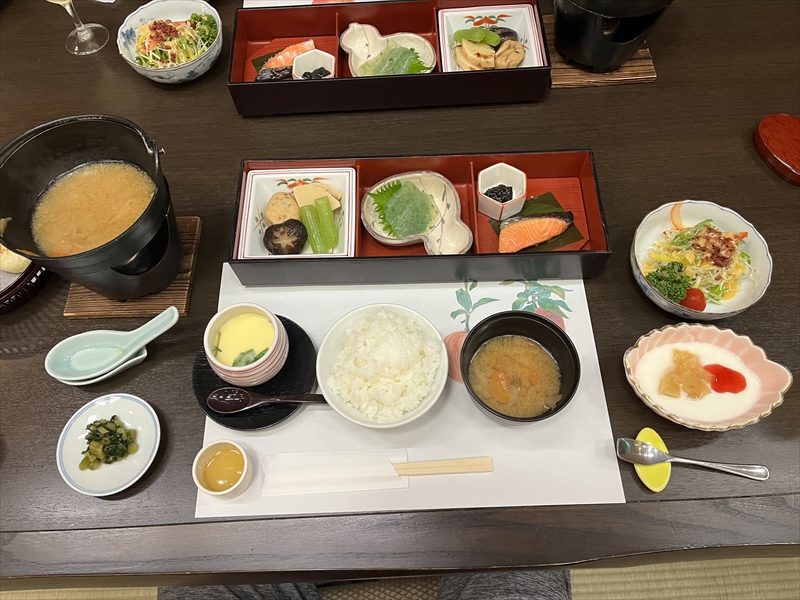 料理はお焼き、焜炉の味噌汁、煮物、刺身蒟蒻、鮭の焼き魚、海苔の佃煮、サラダ、茶碗蒸し、ご飯、漬物、ヨーグルトとなっています。