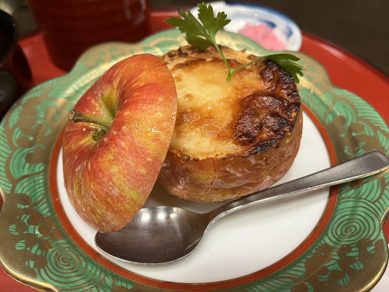 織花名物という林檎のグラタンのリンゴについてスタッフにどういう種類のリンゴかを聞きました。