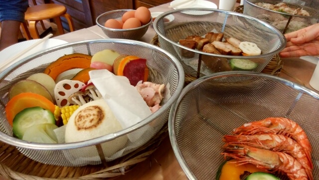 鉄輪温泉の湯治場では温泉の蒸気を利用した地獄釜で自炊しながら長い間療養されていたのですが、今でも地元産の野菜や魚介類を約100度の温泉の蒸気を使って自分で調理できる地獄蒸し釜での調理を体験できる工房鉄輪があります。