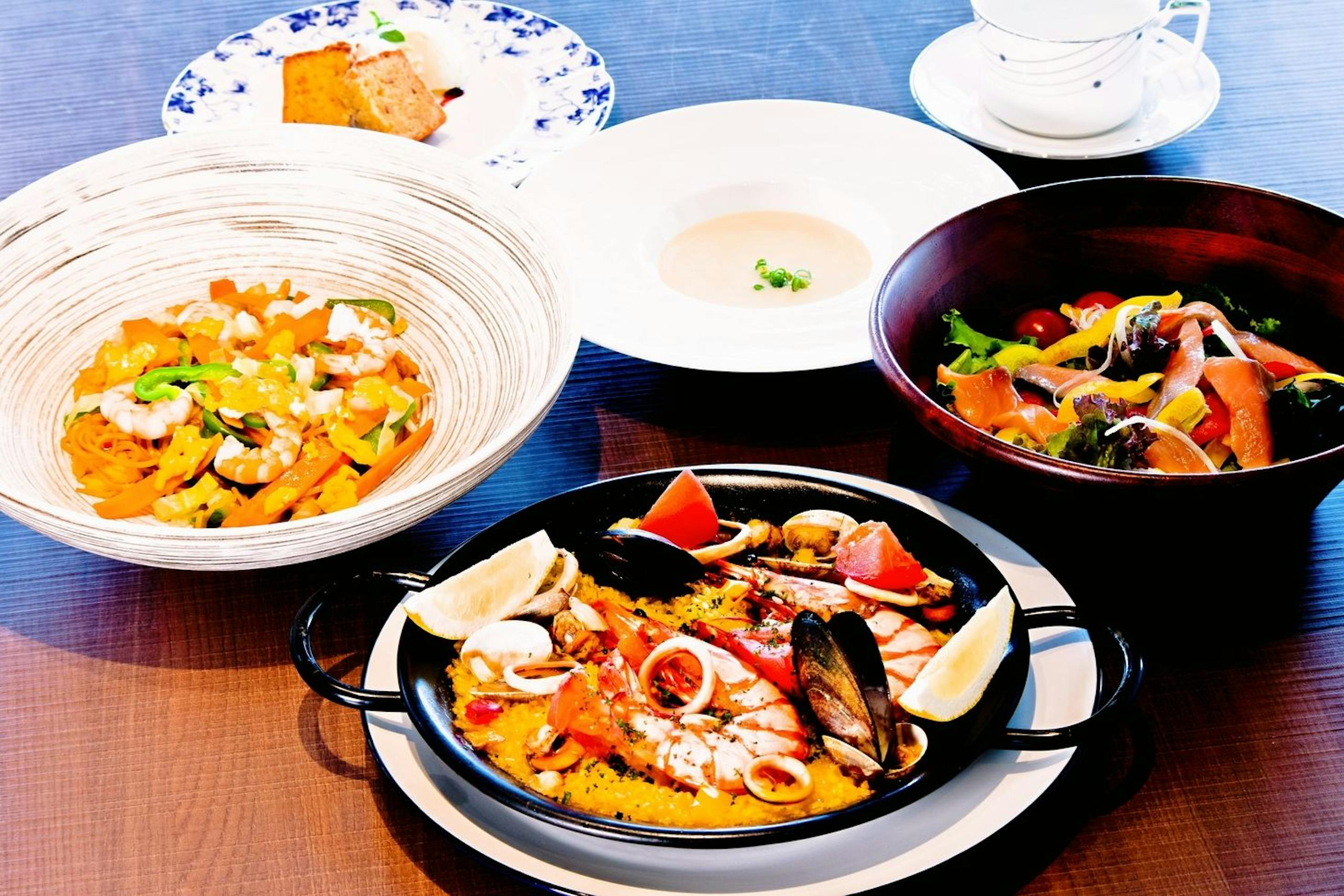 和食の料理は野菜ジュース、彩りサラダ、小鉢八寸箱、冷やしざる豆腐、焼魚二種、海鮮味噌汁(姫サザエ・あさり・長洲産しらさ海老・佐伯産えそつみれ)、ご飯またはお粥、ひじきふりかけ、香の物(自家製床漬け)、鈴木養鶏場朝採れ生卵、安心院町イモリ谷納豆、味海苔、フルーツ、ヨーグルトとなっています。