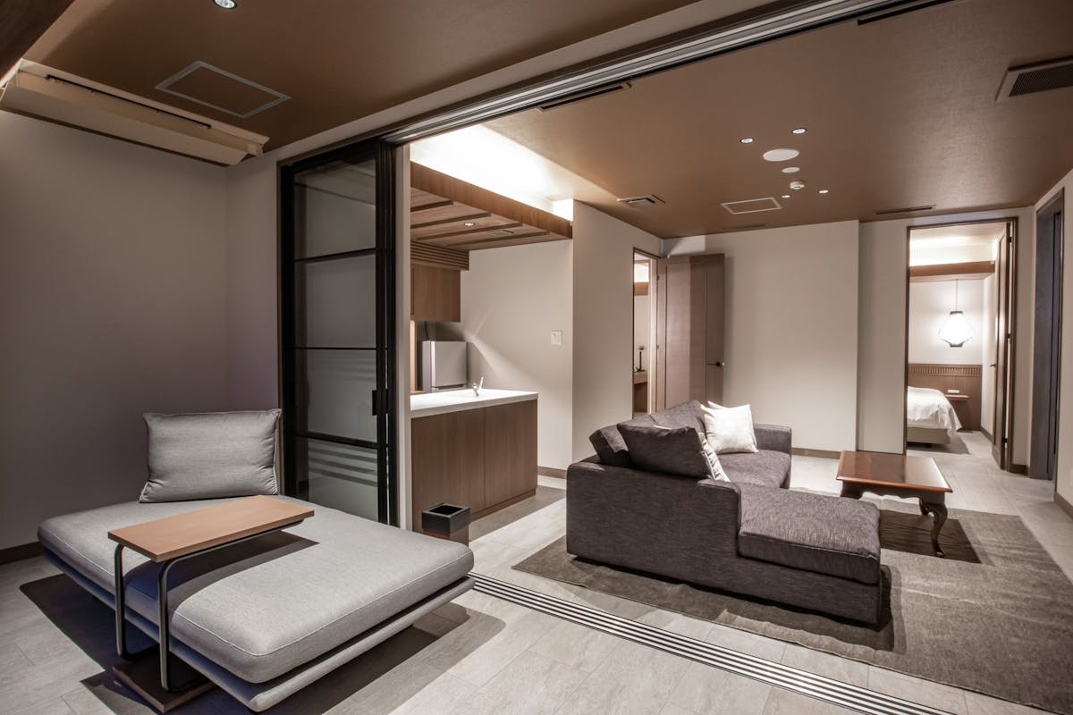 9.8帖ベッドスペース+10.6帖リビングスペース+テラス+半露天風呂+洗面所+トイレ+ユニバーサル仕様のトイレ+テラス