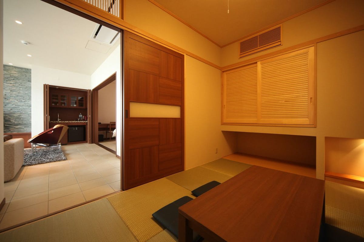 8帖ベッドスペース+8.7帖リビングスペース+和室6畳+テラス+半露天風呂+洗面所+トイレ