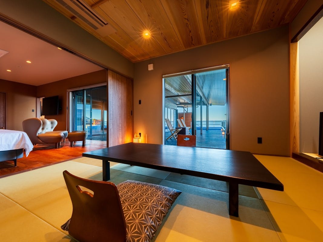 洋リビング+畳和室+源泉掛け流し半露天風呂+シャワーブース+パウダーブース