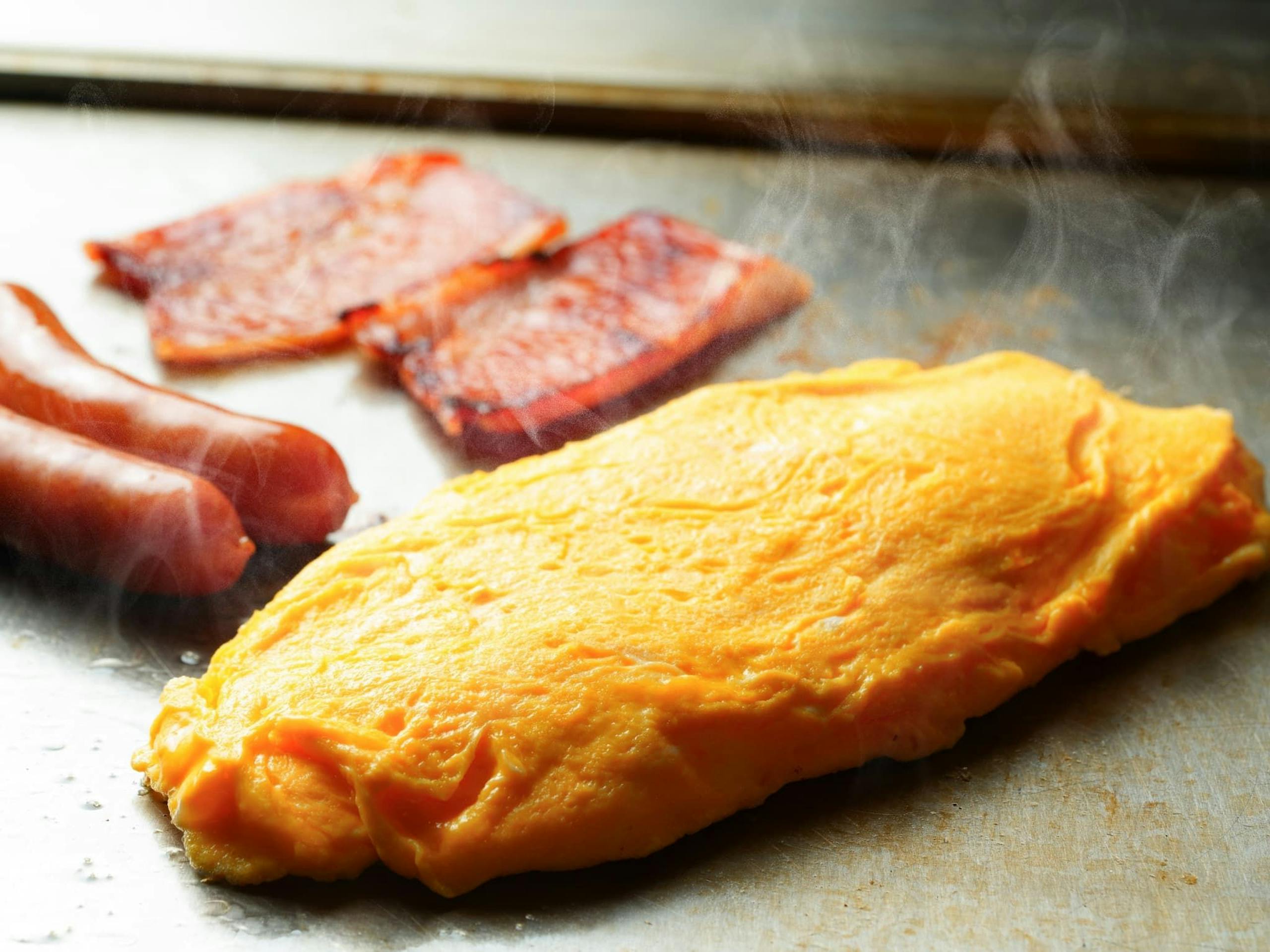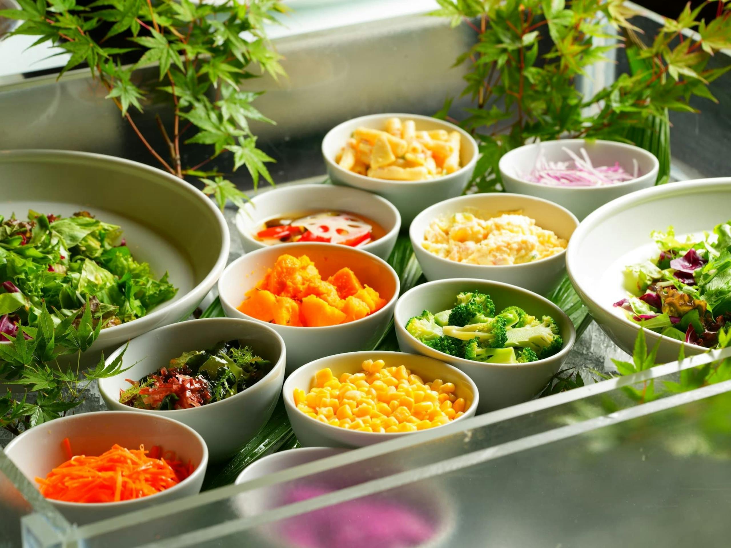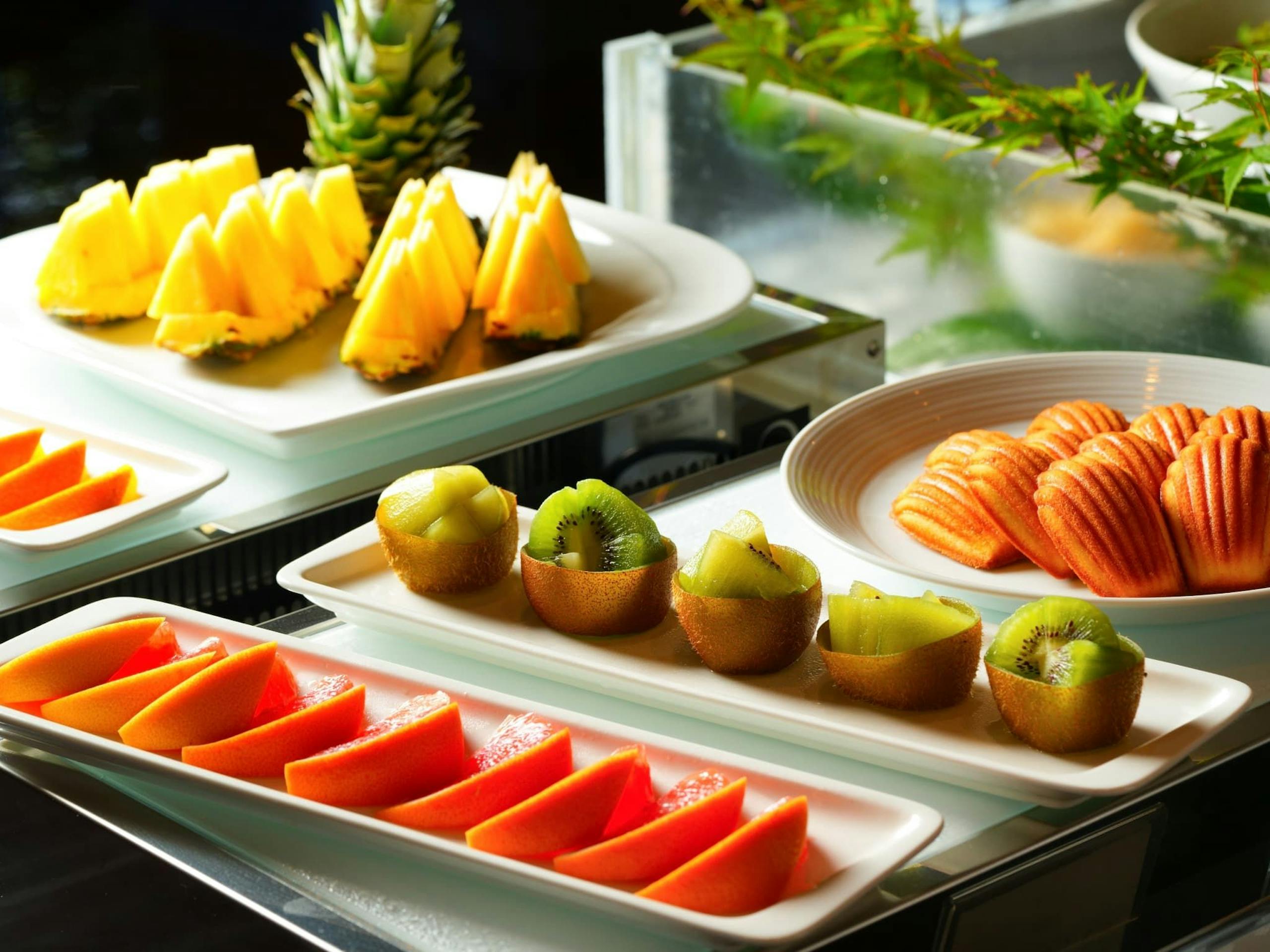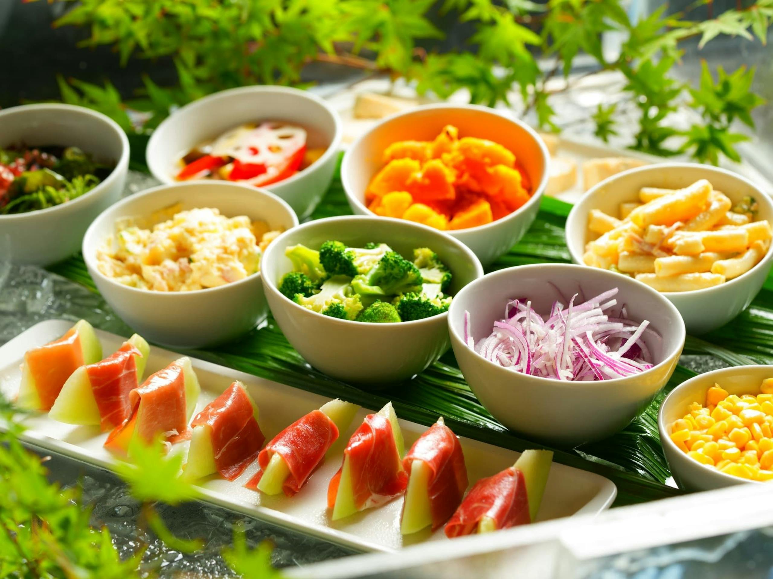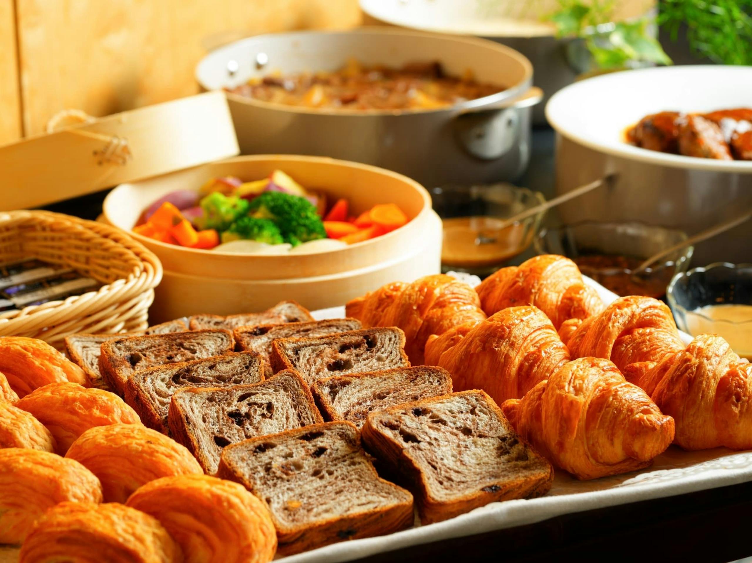 洋朝食の料理は卵料理、ベーコン、ソーセージ、ジャーマンポテト、グラノーラ、サラダ、フルーツ、パン、スープとなります。