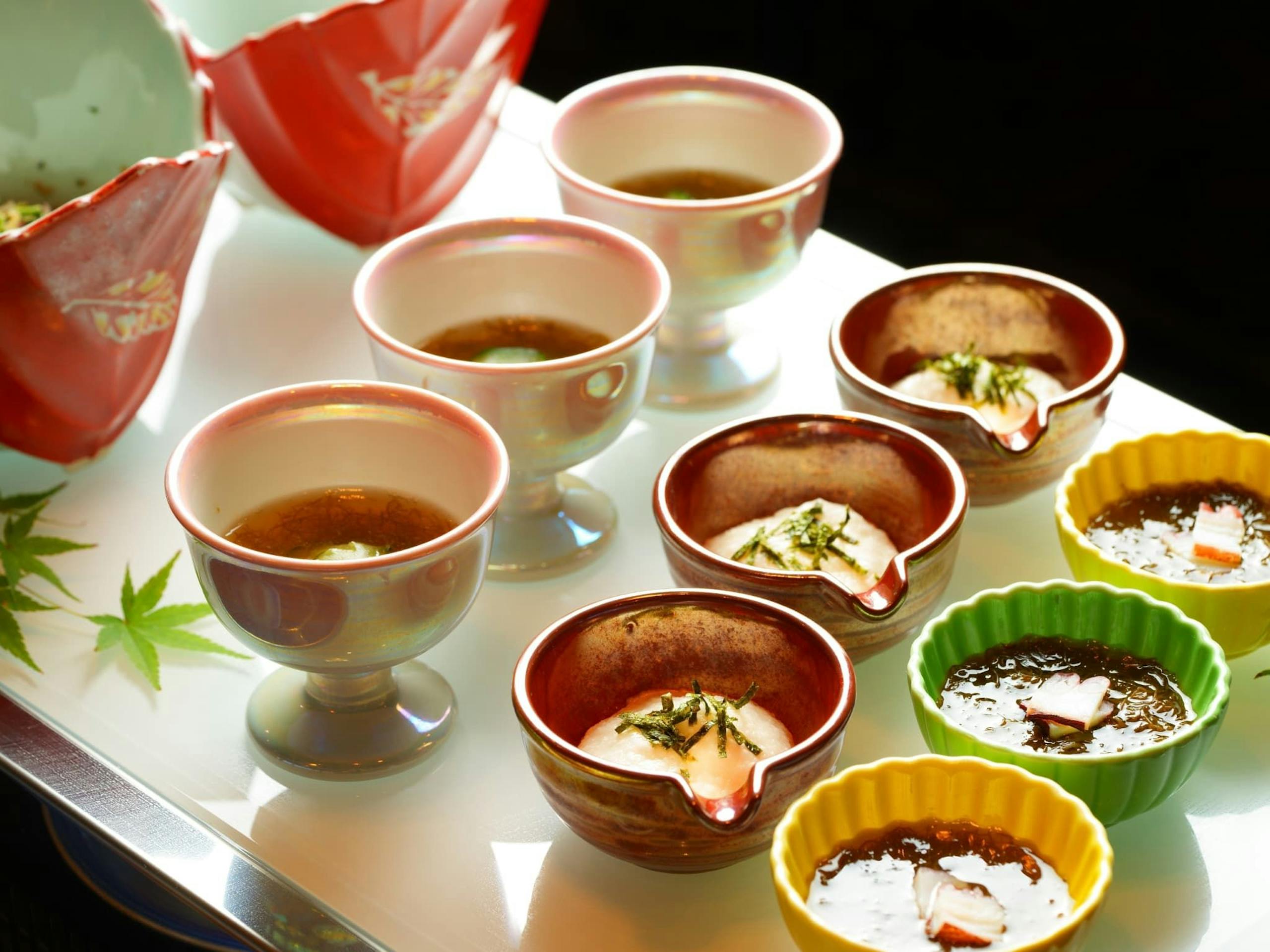 焼八寸:鱒ふき味噌焼き 百合根豆腐 梅肉 美味出汁 有頭海老芝煮 厚焼玉子 栗麩田楽 翡翠一寸豆