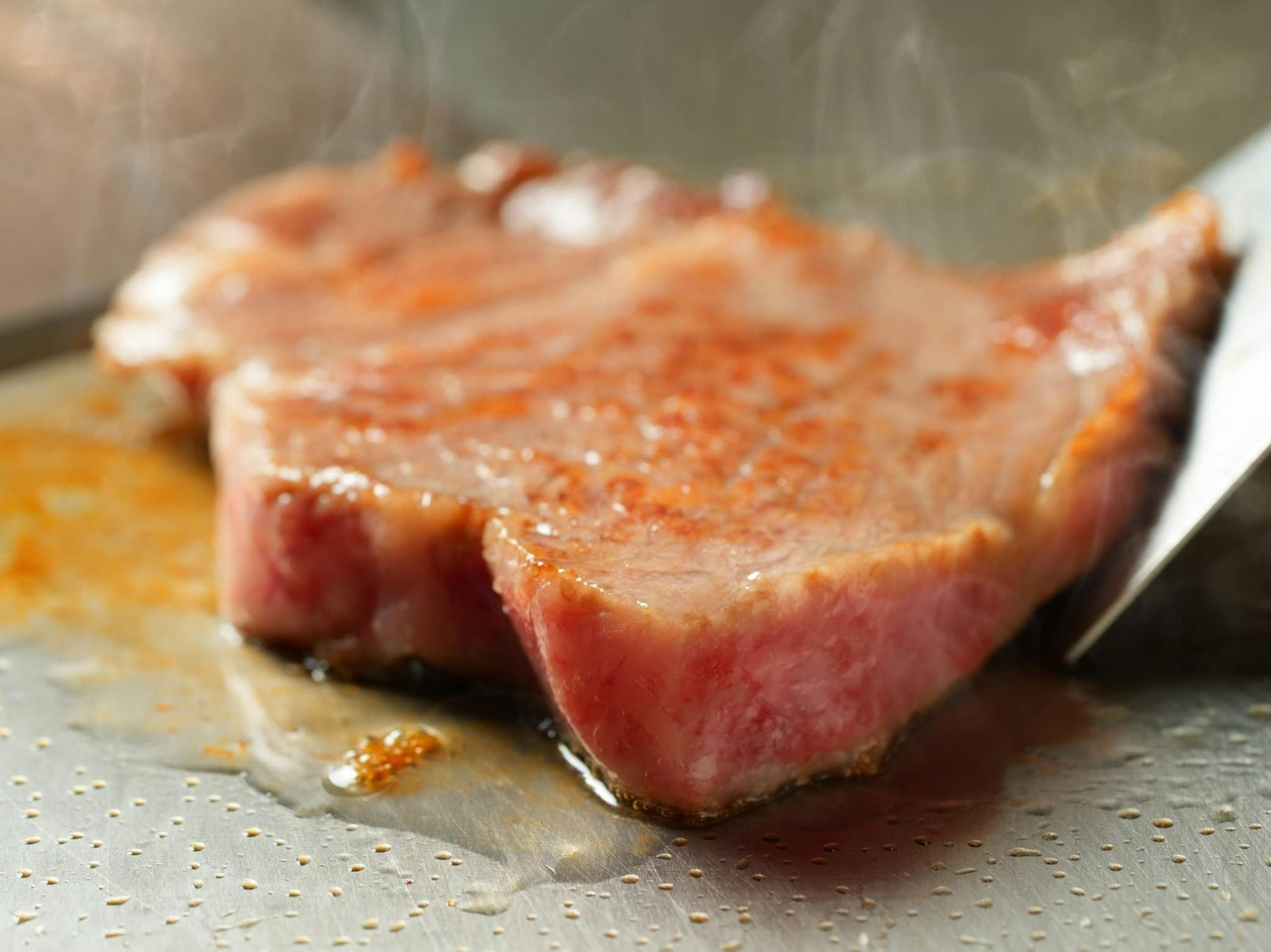 鉄板焼:国産黒毛和牛のステーキ 特製ソースとお塩と共に