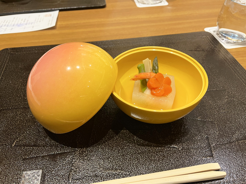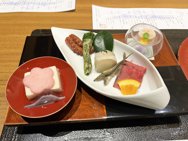 Kaiseki meals begin with appetizers, followed by soup, sashimi, fish, meat, and rice.