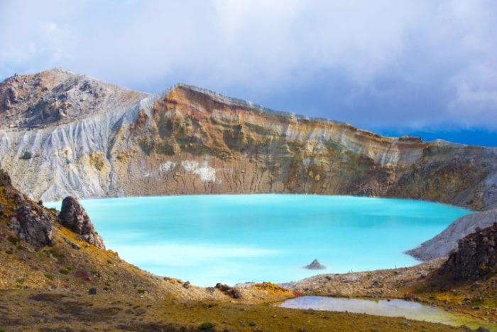 The area around the crater lake has a desolate atmosphere typical of volcanoes, and the beautiful scenery that becomes fantastically colored by the sunlight is otherworldly.