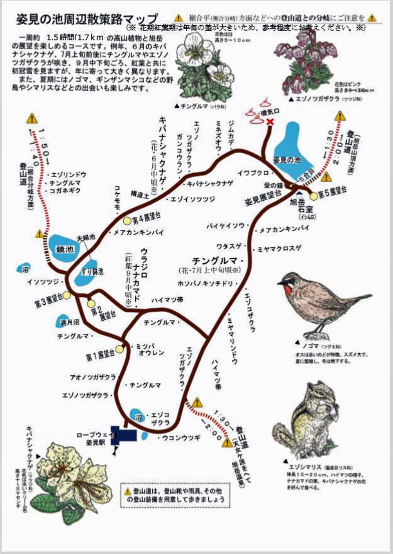 ロープウエイの駅には姿見の駅周辺散策路マップが置かれていますので、こちらをもらいますと散策路の様子がよくわかりますのでもらっておくと良いでしょう。