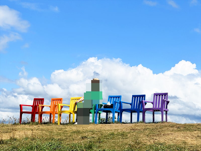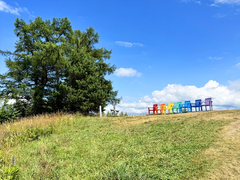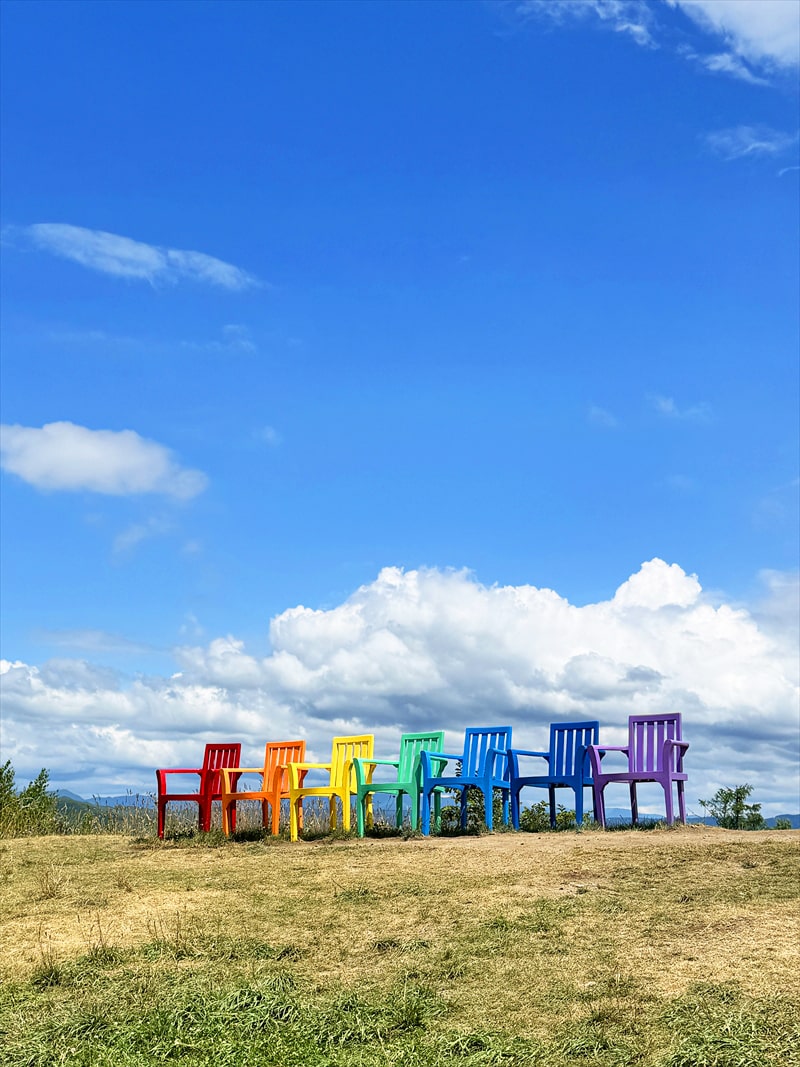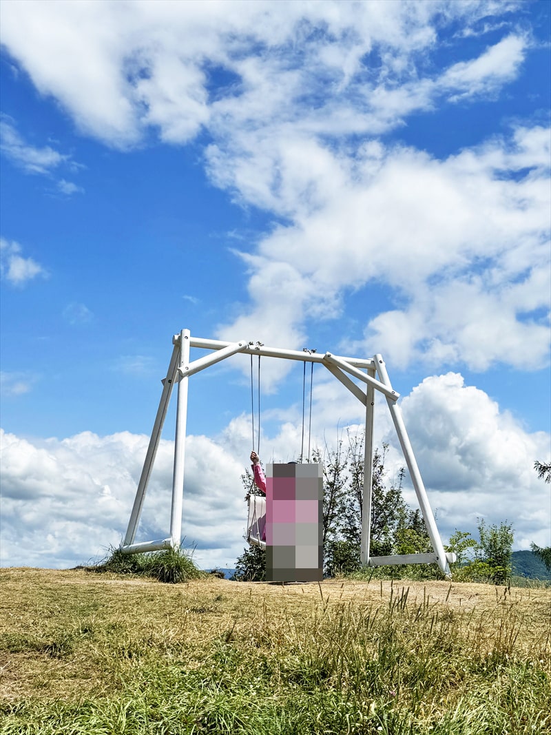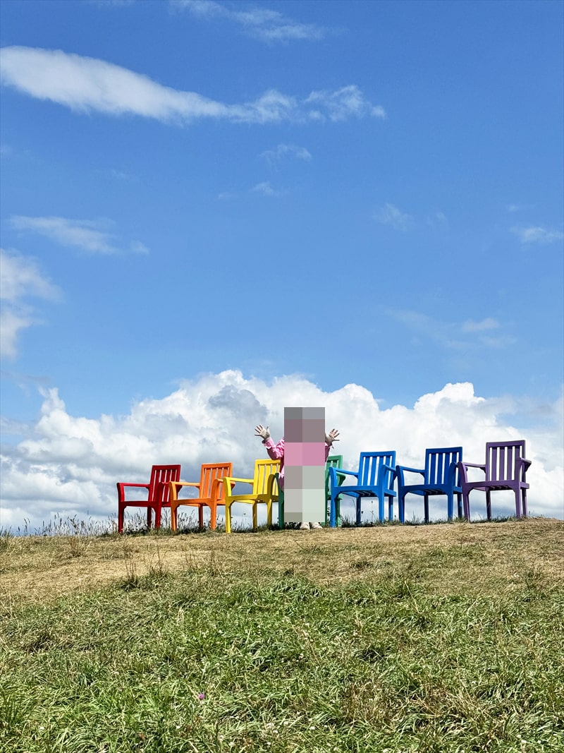 射的山の頂上にはカラフルな椅子やブランコがあって、青い空バックの景色はフォトジェニックな場所でした。