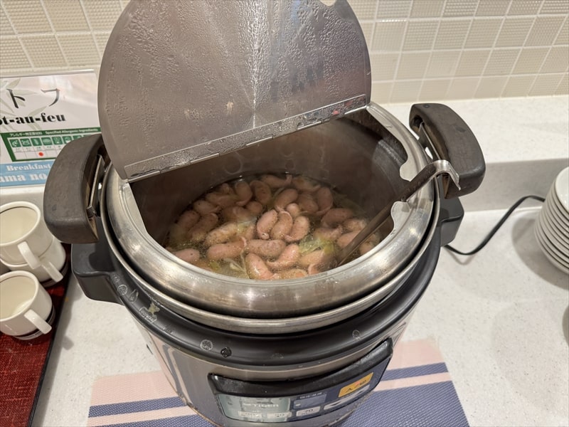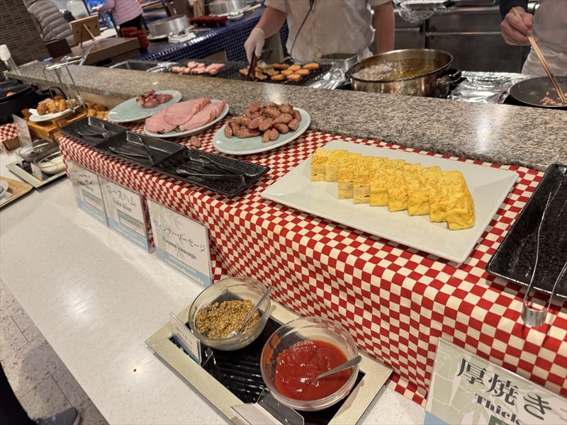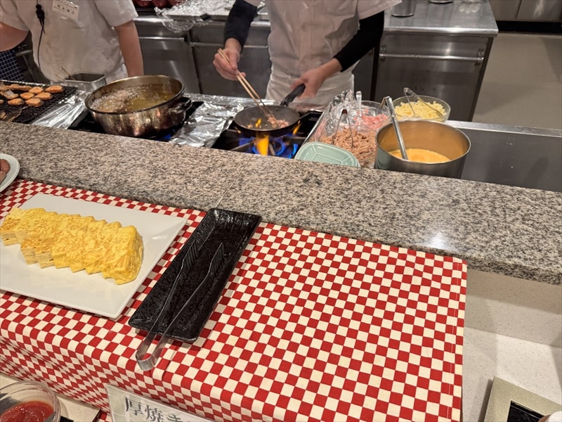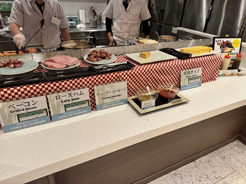 ライブキッチンでは焼き立てのベーコンやウインナーソーセージ、厚焼き玉子、具材を選べるオムレツ、焼魚を作っていました。