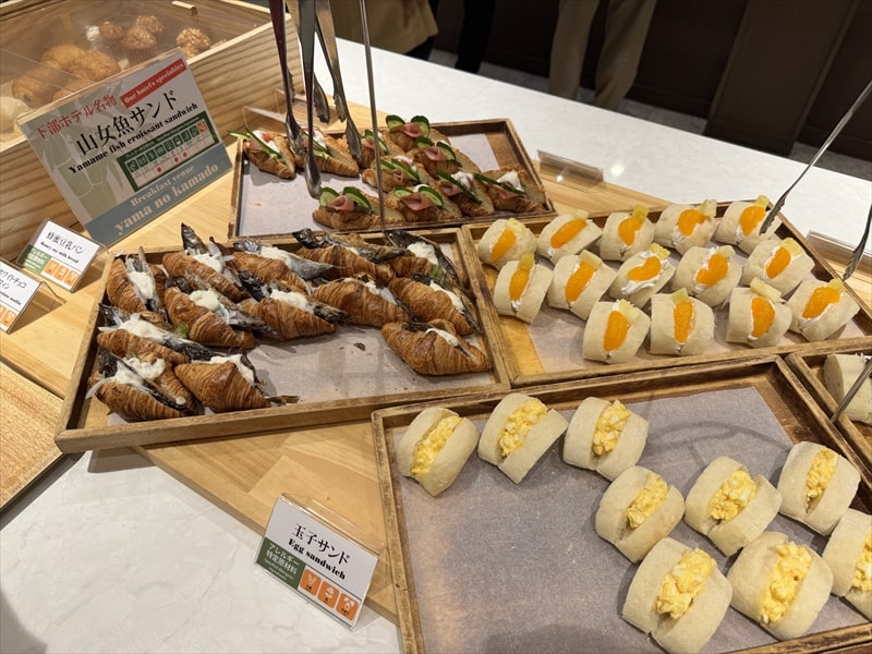 朝食のメインの場所にはサンドイッチなどが置かれていて、サラダサンド、フルーツサンド、玉子サンド、山女魚サンド、ツナサンドがありました。