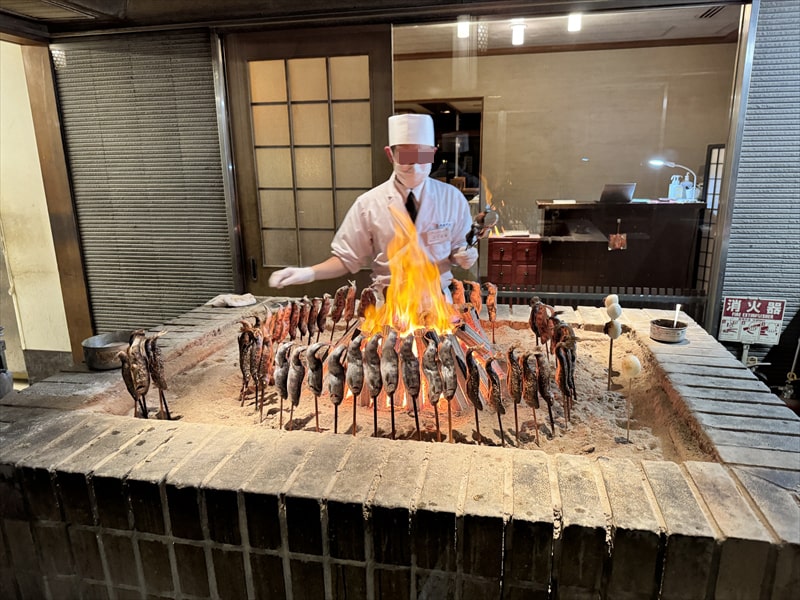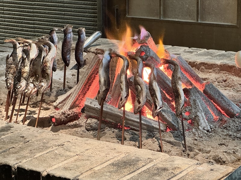 レストランへの通路では炭火焼きで山女魚がたくさん焼かれていましたので夕食の期待が高まります。