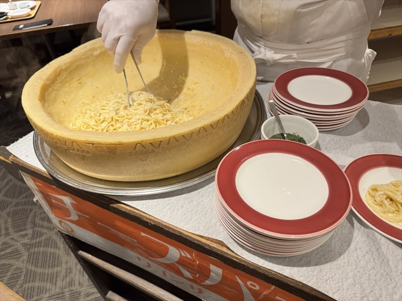 夕食時にはスタッフが各テーブルをワゴンで周っていましたが、ワゴンでは出来立てのチーズパスタを作っていました。