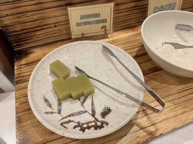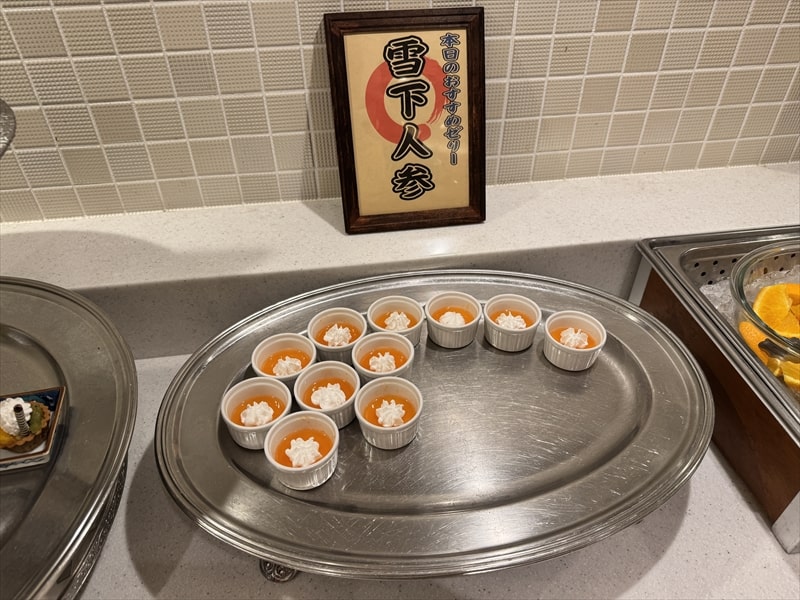 デザートの種類も身延町特産あけぼの大豆羊羹、わらび餅、シューラスク、ケーキ盛合せ、雪下人参ゼリー、フルーツタルト、みかん、パイナップル、オレンジ、キウイとあまり多くありません。