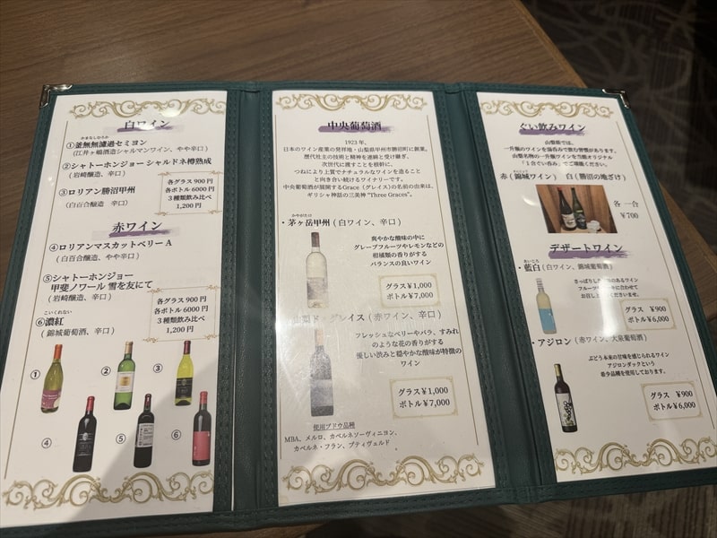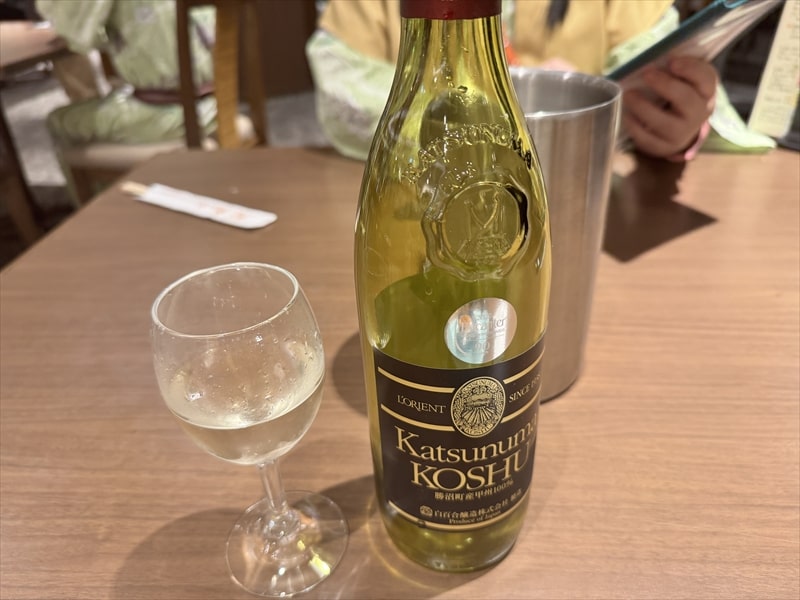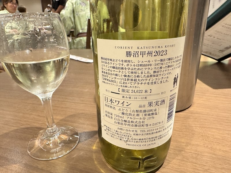 せっかくですから夕食時には山梨のワイナリーの白ワインを飲もうと思い、レストランスタッフに相談したら下部ホテルにはソムリエが居ておすすめのワインは白百合醸造のロリアン勝沼甲州6,000円とのことでした。