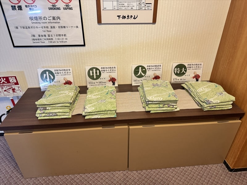 浴衣は客室階のエレベーターホールに各サイズが置かれていますので、自分で選んで部屋に持って行きます。