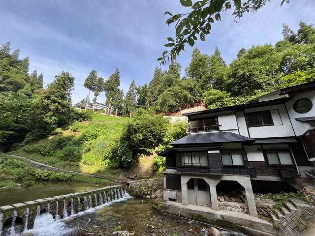 銀山温泉街に入る橋から50メートルほどの場所にあります。