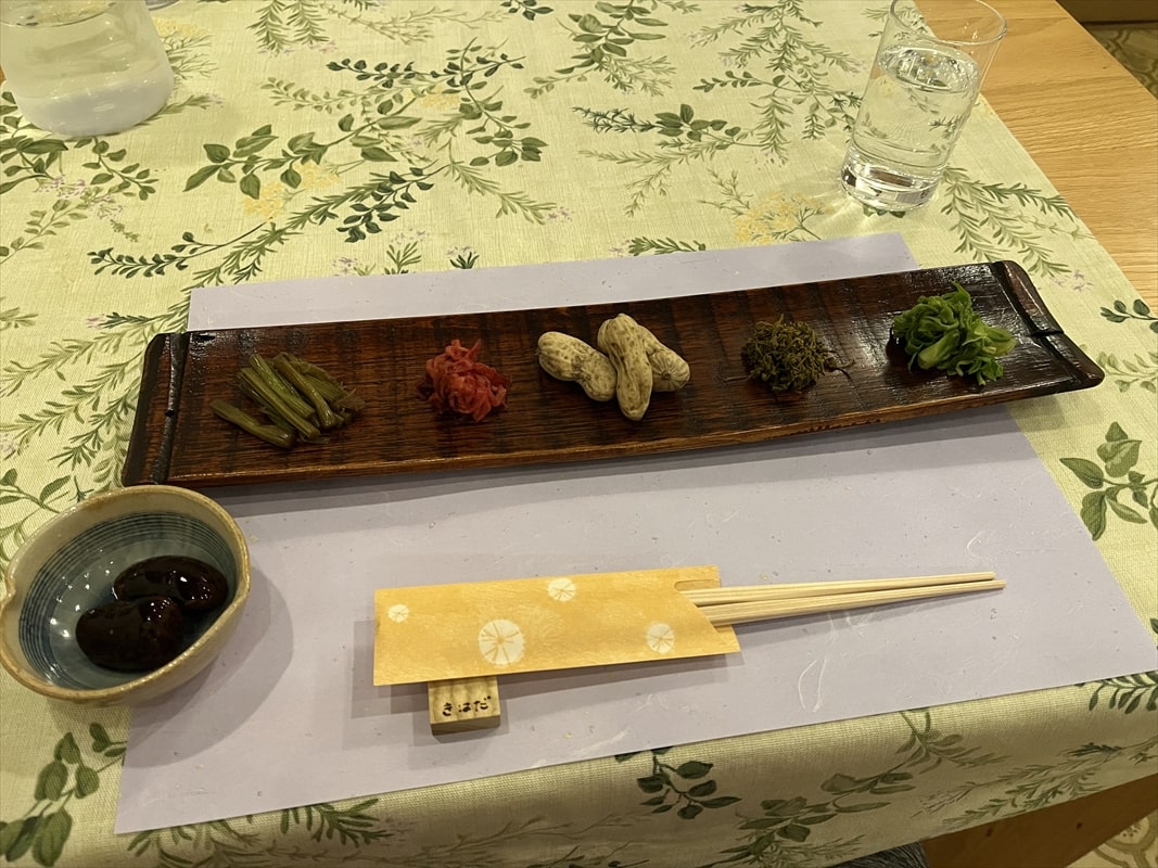 こちらが前菜できゃらぶきや茹でた生落花生、花豆、山椒などでした。
