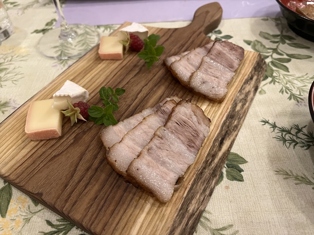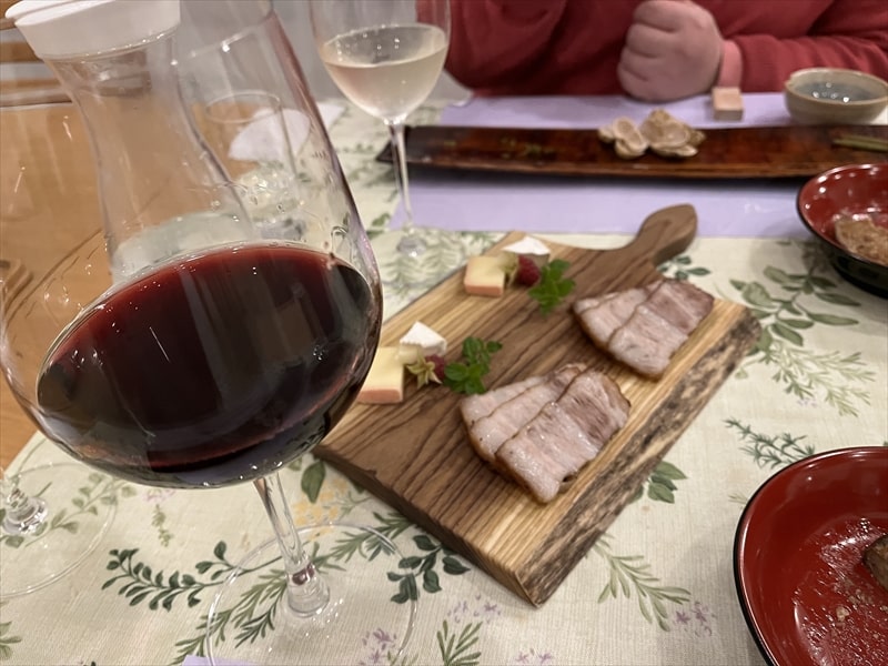 豚肉と地元のカマンベールチーズのプレートが出されましたので、思わず小布施ワインのメルローを頂いてしまいました。