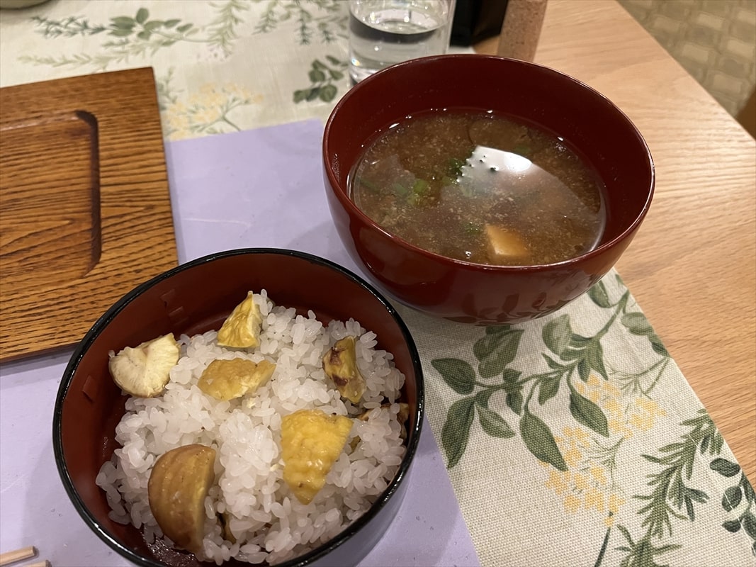 ご飯は今の時期らしく栗御飯と地元のなめ茸の味噌汁となります。