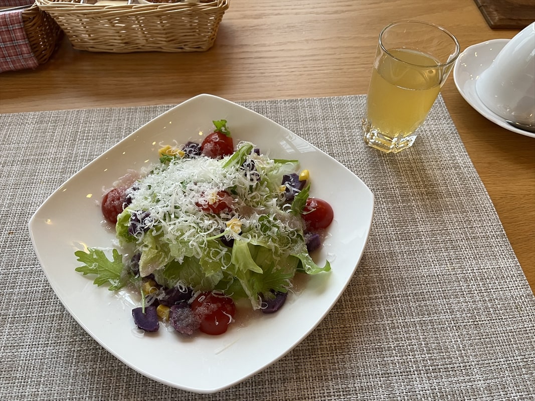まずは新鮮な野菜サラダとしぼりたてのリンゴジュースでスタートです。