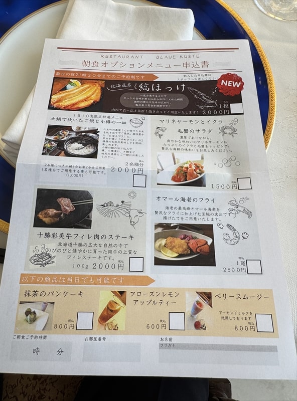 また夕食時に翌日の朝食のオプションメニューも案内されました。