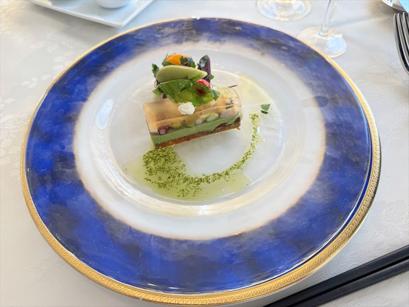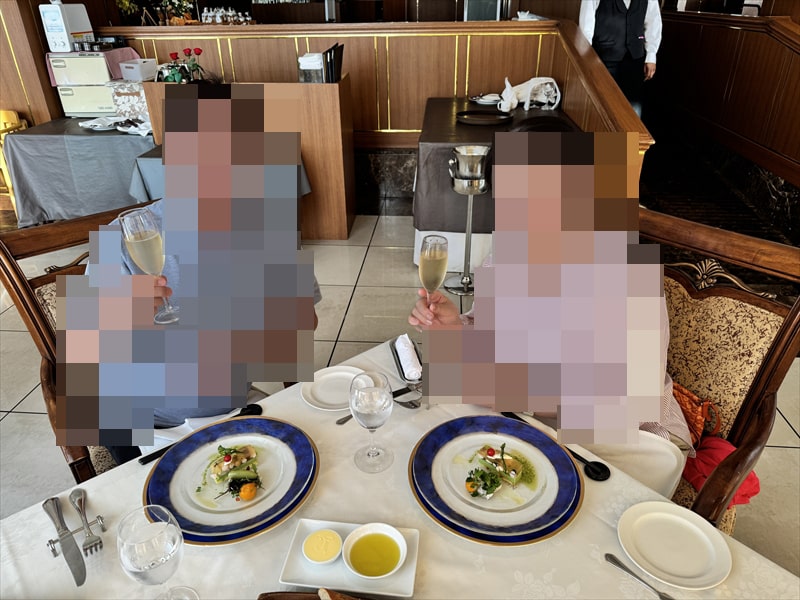 夕日に染まるノイシュロスシーズナルスペシャリティ:トマト・トウモロコシ・甘海老・鱧・グリーンピース